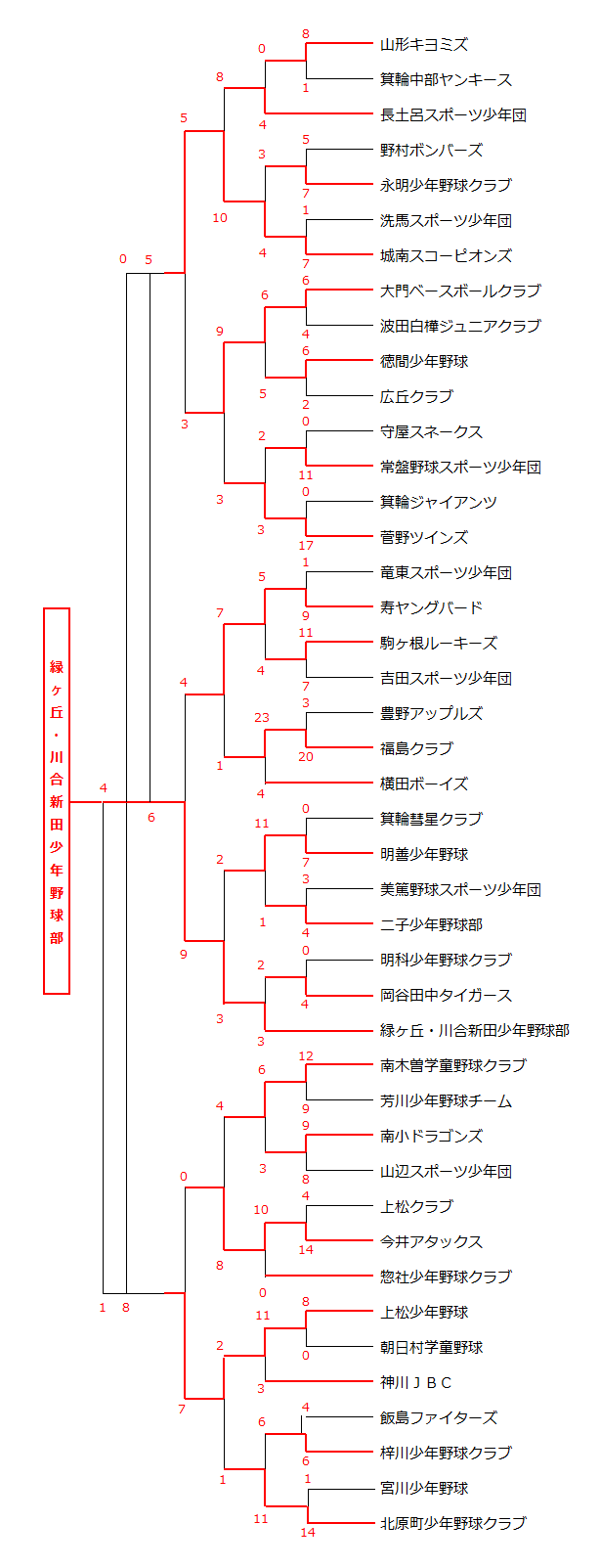 | 緑ヶ丘・川合新田少年野球部 | 0 | 4 | 0 | 1 | 1 | 6 |